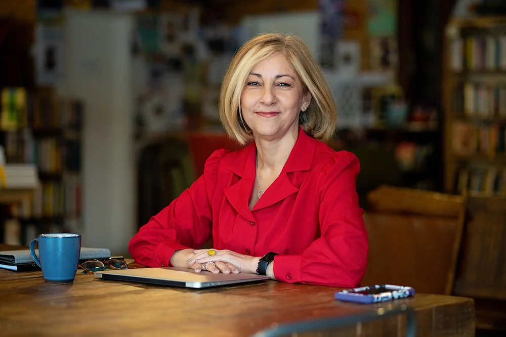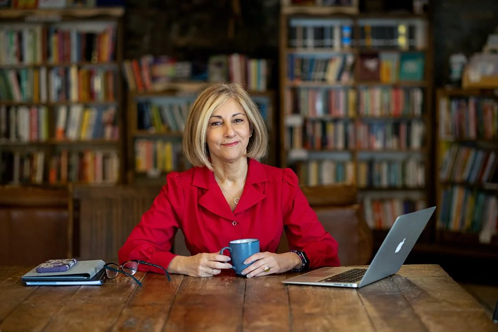 Psychologist Shideh and I planned her wardrobe via Zoom and photos texted after we got clear that she needed at least two website images - a “Welcome”, and one for the About page. She sees clients and holds workshops, and made sure to get a collection to use as her business expands. We met at a beautiful coffee shop/bookstore that we were both very familiar with. This helped us pick the time of day with great light and few customers. I always want to be mindful when I shoot on location. (Make arrangements with the owner well in advance)